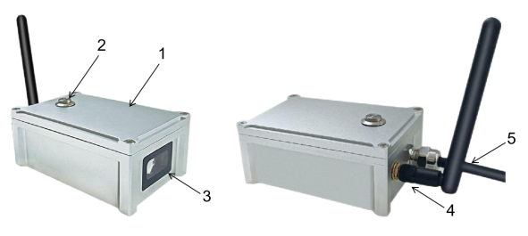 ①铝合金外壳 ②开关按键指示灯 ③激光传感器镜头 ④4G 天线 ⑤线缆